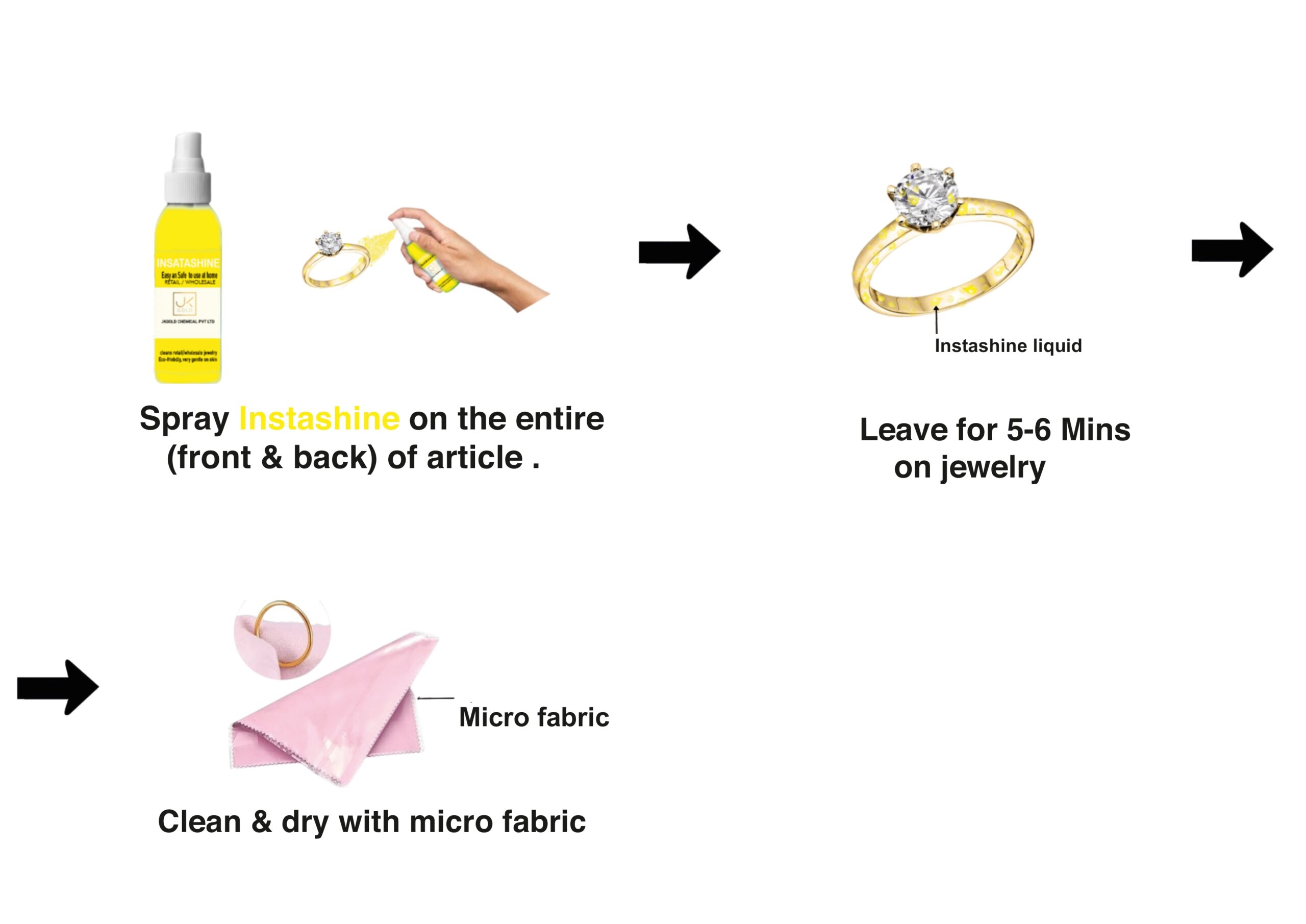 This is chemical liquid designed for easy, safe use at home, retail counters, or wholesale workshops, especially for yellow gold, silver rose gold, ad, and stone-studded jewelry. Instashine is a ready-to-use gold enhancer/dip solution that instantly brightens and refreshes the look of jewelry without plating, buffing, or heat. Can be used all metals and all diamond and color stones. Pearl’s and moonga etc also.